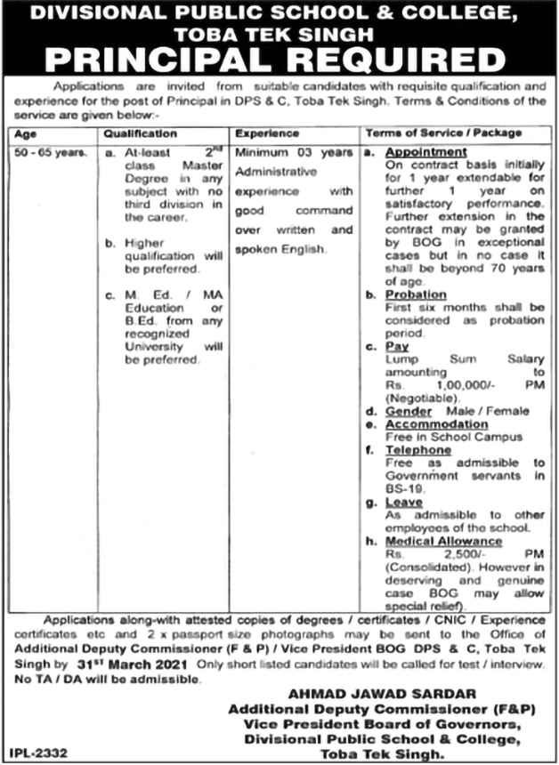 Recently, the divisional public school and college Toba Tek Singh announced the vacancy for the principal post. Candidates having experience and required qualification can apply for the announced post. However, for the posts, the required age is 50-65 and a masters degree in any subject. Thus, interested candidates can apply for the principal post in DPS&C TT Singh by applying. However, the last date is 31 March 2021.
