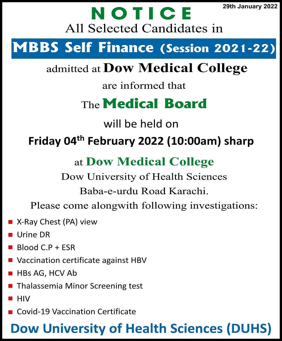 The DOW University of Health Sciences (DUHS) issued a notification regarding the MBBS Medical Board 2021-22. According to the university notice, the University will hold the Medical board on 04 February 2022 for the self-Finance students. So, all the admitted students in MBBS for the self-finance admissions will come to the campus for the medical examination. So, candidates will come with the following things.