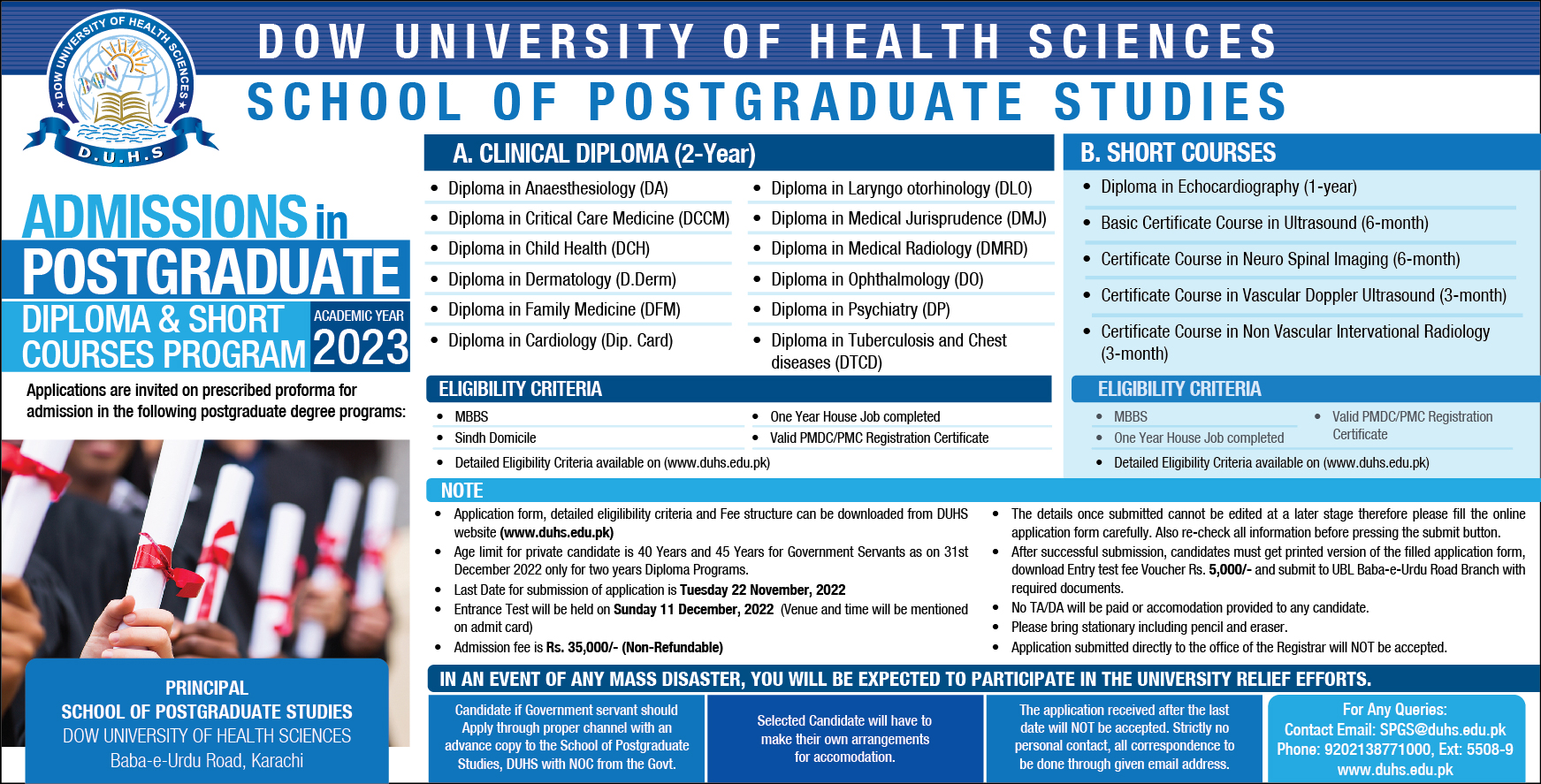 Dow University of Health Sciences announced the admissions 2023 for the following Postgraduate clinical diplomas and short courses.