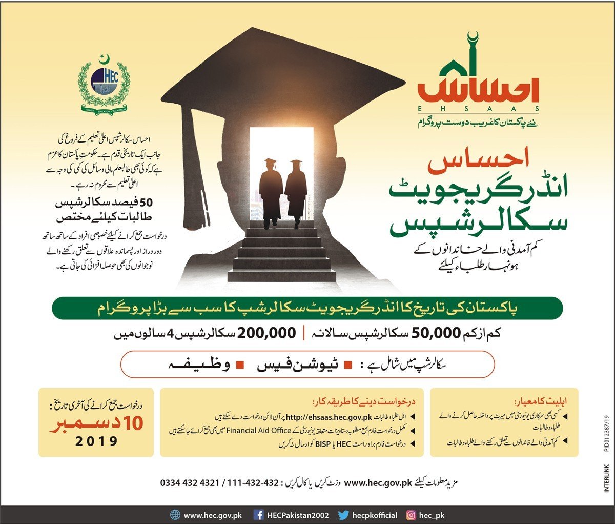 - For applying, visit the official website of the Ehsaas Scholarship Program here: http://ehsaas.hec.gov.pk.