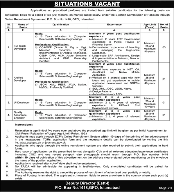 The Election Commission of Pakistan invites applications for the latest career job opportunities. Both males and females can apply through the proper channel. ECP is looking well-motivated and talented individuals for the position of Android Developer, Full Stack Developer, Quality Assurance Engineer, and UI Developer. The job is on a permanent basis. Applicants having Master degree holders can apply through the proper channel. The last date for submission of the application is 29th July 2022.
