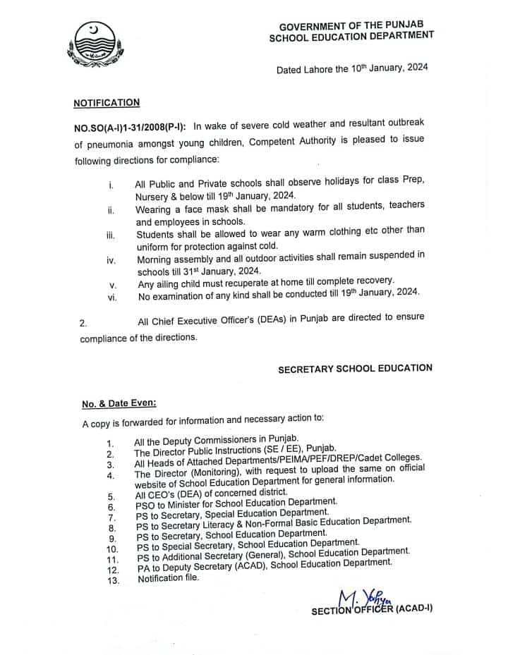According to Caretaker CM Punjab, the schools across Punjab have been orally notified about the preventive measures. The official notification is attached below