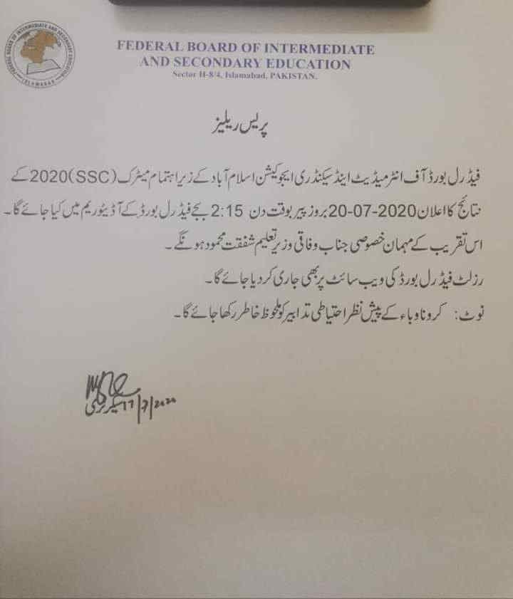 The board will announce the result on 20 July 2020 (Monday) at 2:15 PM. Federal Education Minister, Shafqat Mahmood will attend the resulting ceremony as chief guest.