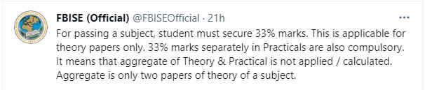 The federal board stated that to pass a subject, 33% marks in each subject is compulsory. So, students have to secure 33% marks in theory and 33% in practicals separately. “It means that the aggregate of Theory & Practical is not applied/calculated. Aggregate is only two papers of the theory of a subject”. Stated FBISE.