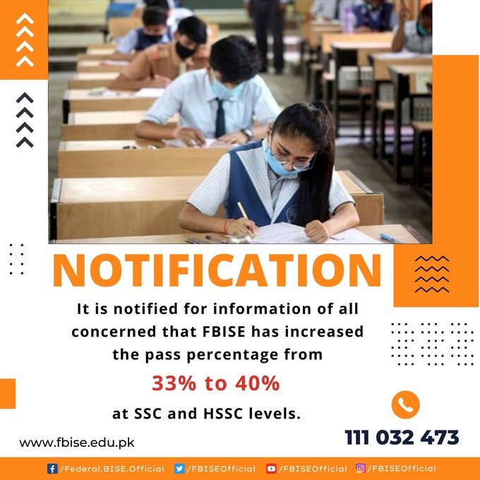 According to the Federal Board notification, the board decided to increase the passing percentage for the SSC and HSSC candidates. So, now students must secure 40% marks to pass the SSC and HSSC Exams instead of 33% marks. Howvere, this policy to increase the passing percentage is for all Pakistani and abroad candidates.FBISE Notice on Increase in Pass Percentage