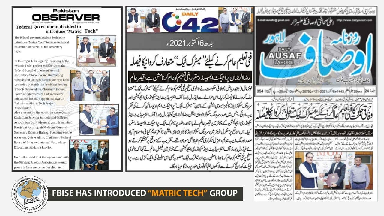 According to the latest notification of the FBISE, the federal government has introduced the Matric-Tech group at the elementary level. For this, FBISE has held a signing ceremony and signed the MOU with Serving Schools and Colleges Association. However, during the signing ceremony, FBISE elected the service Schools and Colleges Association president as an Ambassador of the Matric-Tech Project. However, the chairman of the serving institutes association, Islamabad president, and general secretary were also present at the signing ceremony.