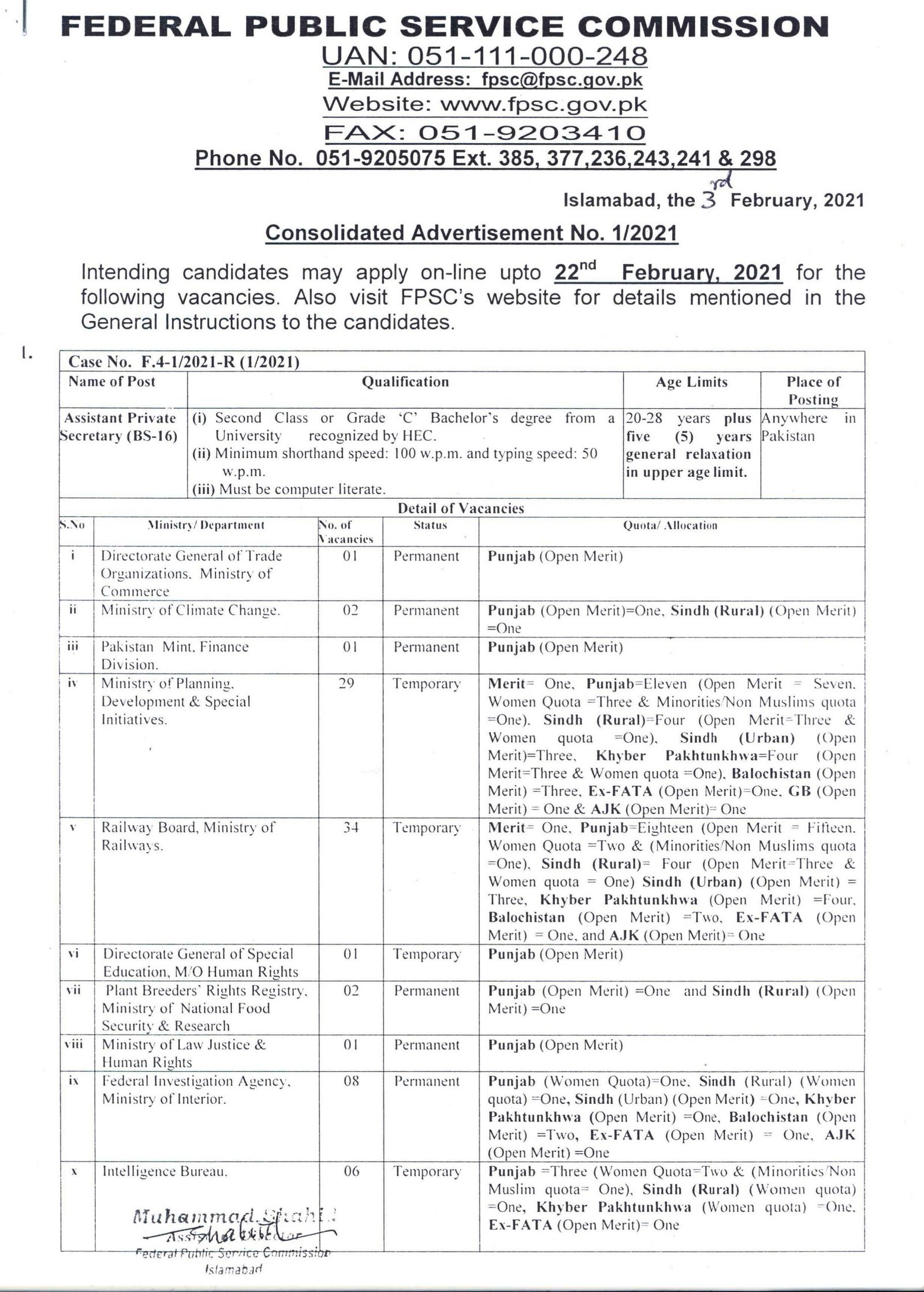 Below are the details of the Federal Public Service Commission (FPSC) advertisement No. 01/2021.