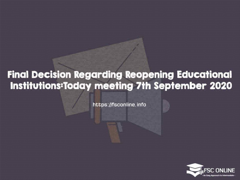On 07 September 2020, the meeting of interprovincial Education ministers held to resolve the issue of reopening the schools. In the meeting, all education ministers participated and decided to open the institute from 15 September 2020. The ministers of AJK and Gilgit Baltistan also attended the meeting.