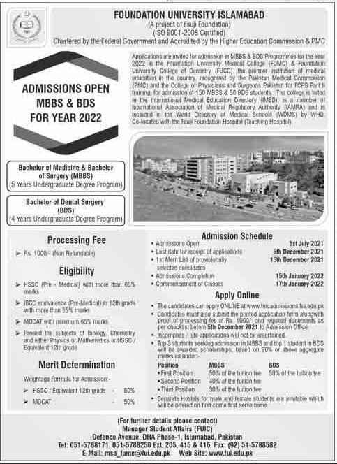 Check out the complete details of Admission in Foundation University Islamabad. The details are as under