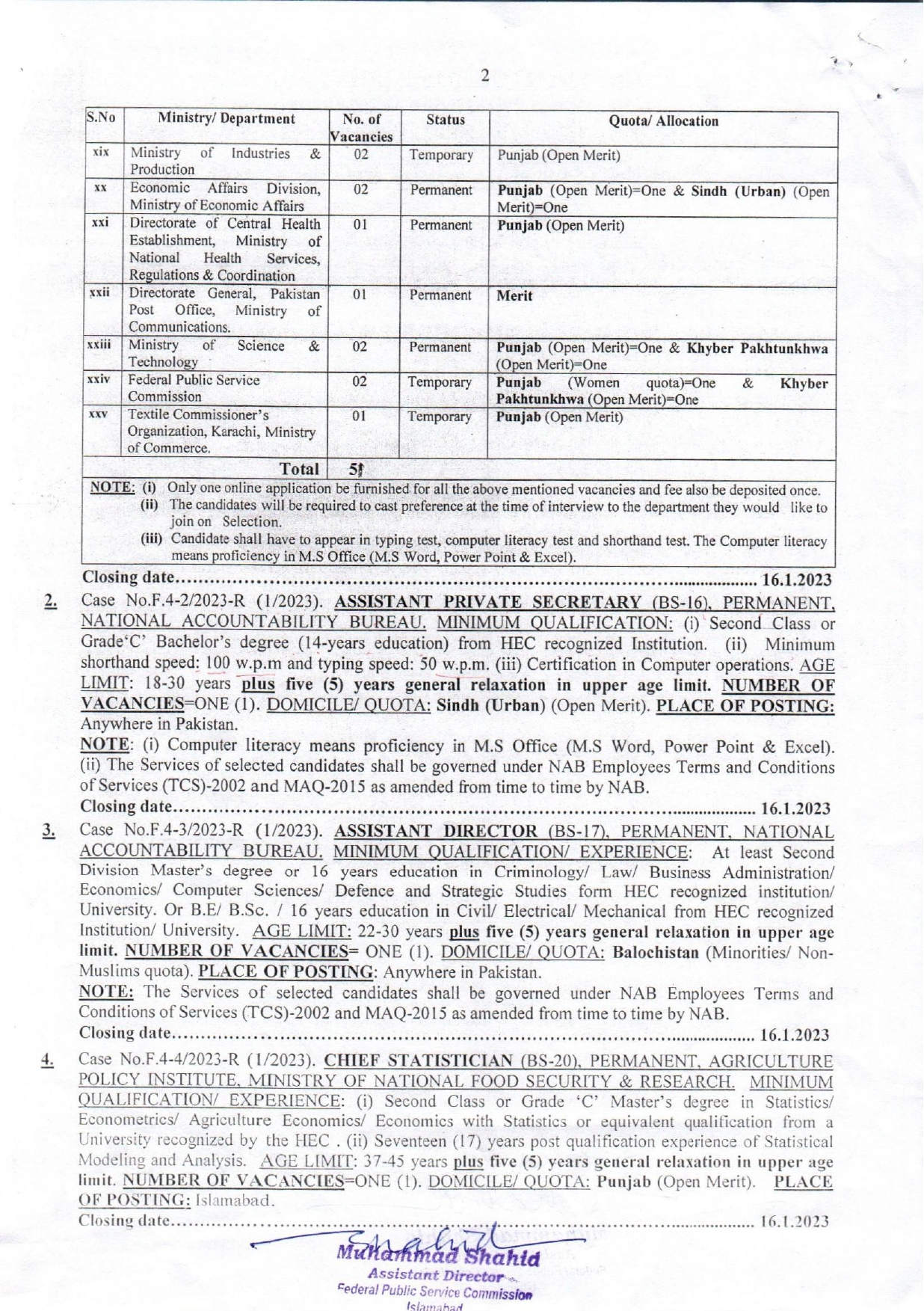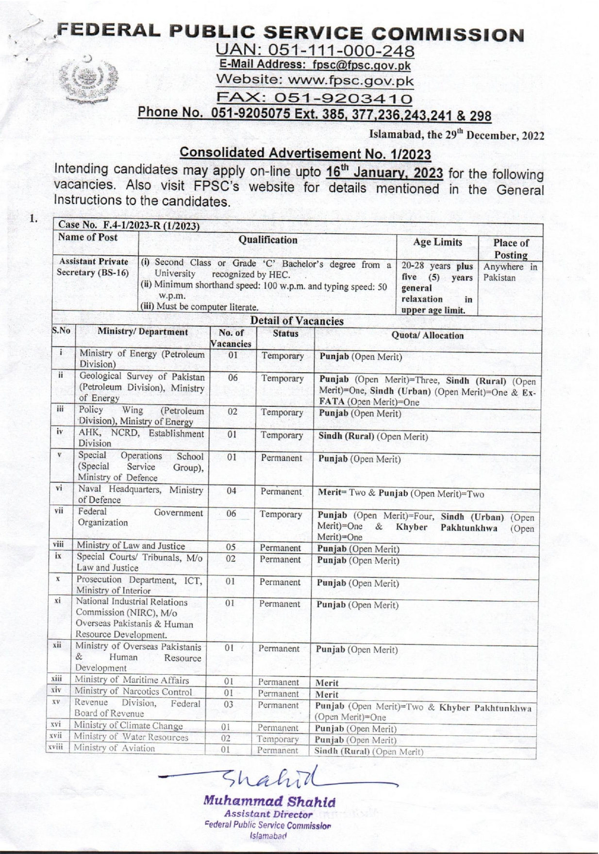 This new year brings an amazing job opportunity for federal candidates searching for government sector jobs. According to the latest FPSC notification, we are glad to inform you that the Federal Public Service Commission FPSC invites applications for the latest career job opportunities for session 2023. All males and females who fulfill the eligibility criteria can apply for this vacant position. They are looking for well-motivated and talented individuals for the position of Assistant private secretary, Assistant Director, Chief Statistician, General Staff Officer, Senior Research Officer, Director, Civil Labour Officer, and many more. The last date for submission of the FPSC job application is 16th January 2023.