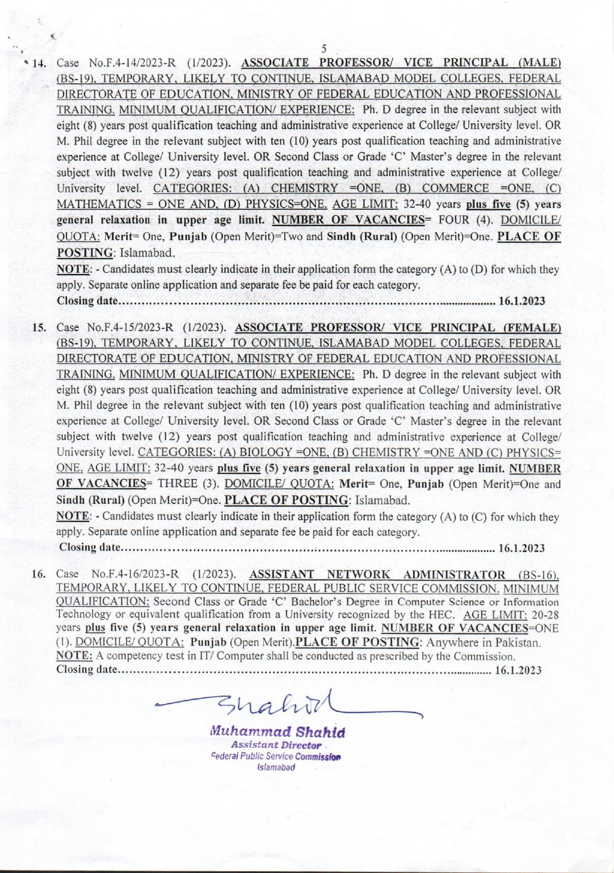 The last date for submission of FPSC advertisement no 01/2023 jobs is 16th January 2023