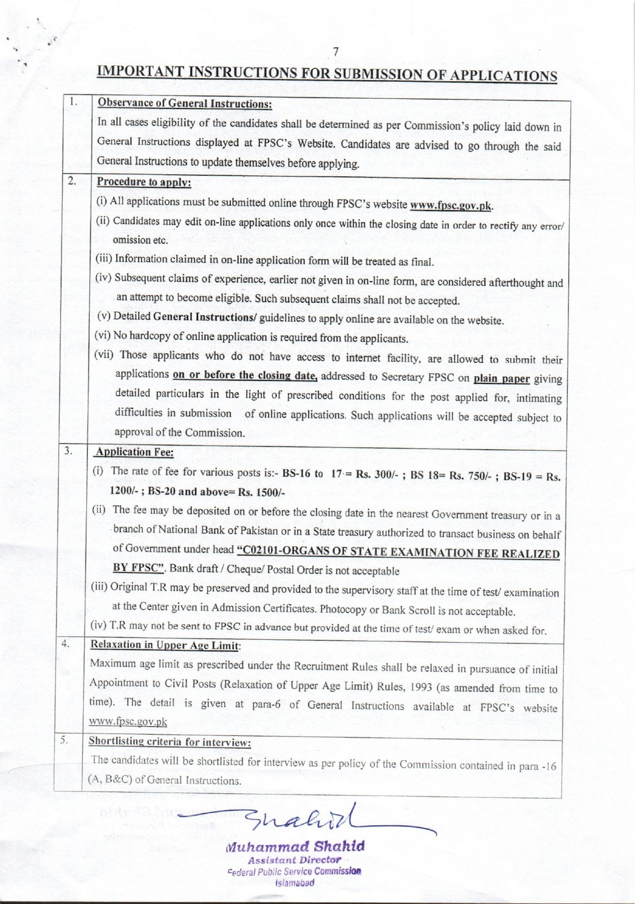 - Application Fee for BS-16 is Rs. 300, BS-18 is 750/-, BS-19 is 1200, and BS-20 and above is RS. 1500.