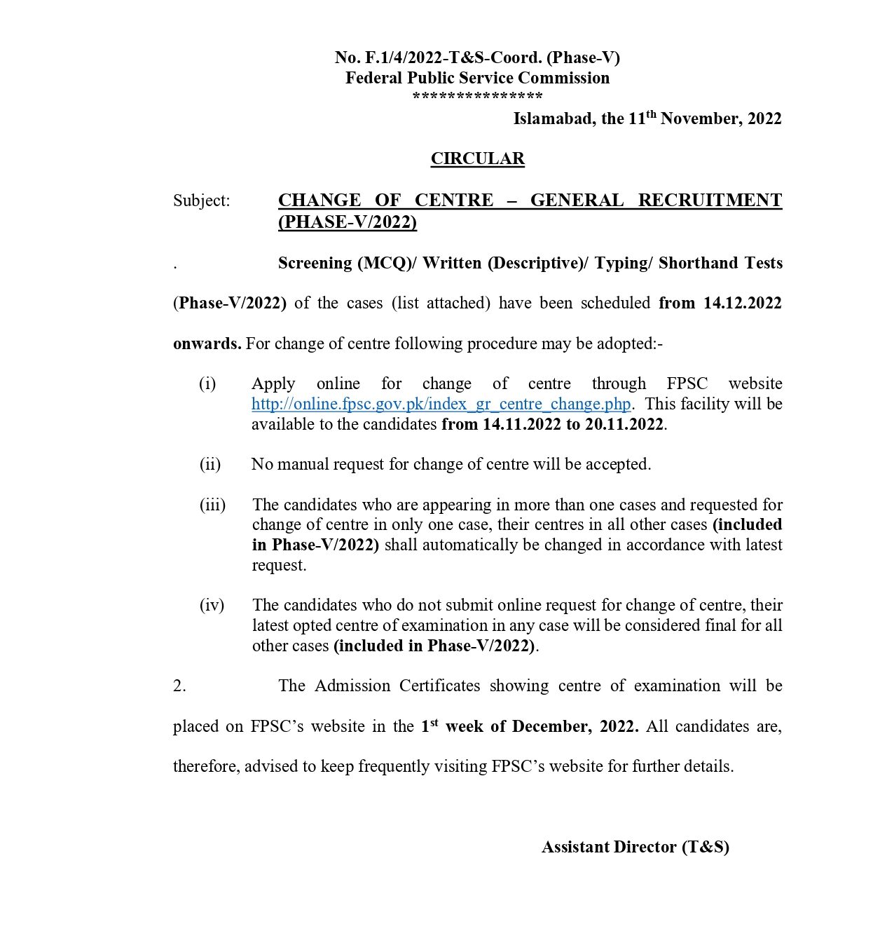 - Candidates who applied for more than one post don’t need to apply for the change the centers separately. Application for 01 posts will automatically change the centers for other applied posts of the FPSC included in Phase V/2022.