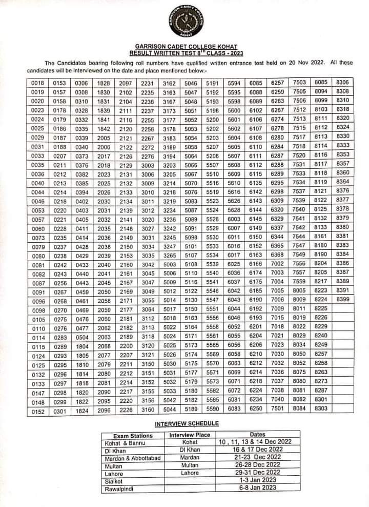 Are you a student of Garrison Cadet College and looking for 8th-class results in 2022? If yes, then you arrived at the perfect place. The Garrison Cadet College Kohat officially declared the 8th class result online today. Those who appeared in the written test will now check the detailed result from here. The majority of male and female students appeared in the test. We also shared a detailed list of the candidates who successfully passed the written test. Per the details, the 8th class written test will take on 20th November 2022. Now, after finalizing the result, they officially declared it online. All students can check the result online by following the below-mentioned steps. The candidates bearing the following roll number have qualified written entrance test held on 20th November 2022.