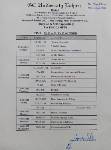 Are you looking for a Bachelors Spring 1st Semester annual examination date sheet 2022 of GCU Lahore KSK campus? If yes, then you reached the perfect place. The Government College University Lahore announced the final exam date sheet of various bachelor’s degree programs for 2022-2026. They announced the date sheet of various BS programs like History, Art History, Media and Communication Studies, Geography and Physical Education. The annual exams will commence on 9th May 2022 and end on 18th May 2022. The time duration of the paper is 9:00 AM to 12:00 Noon. A student who belongs to any of the degrees mentioned above will now view and download the date sheet online.