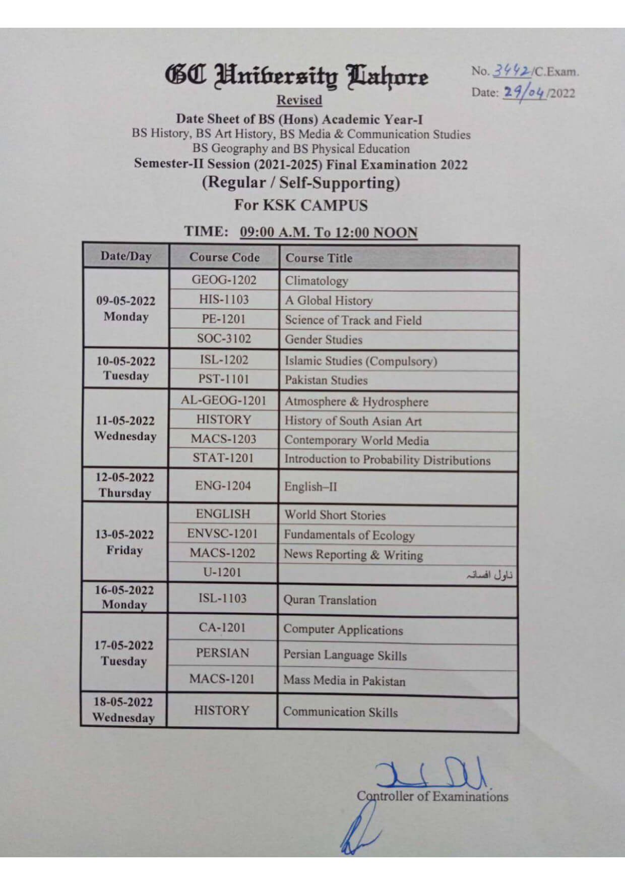 According to the Date Sheet, GCUL will commence the BS 2nd semester exams from 09 May 2022 to 18 May 2022. However, the university issued the Date Sheet 2022 for the BS in History, Art History, Media & Communication Studies, Geography, and Physical Education. The timing for the BS 2nd Semester final exams will be from 9:00 AM to 12:00 Noon. The university has also announced the date sheet for the BS 1st Semester Date sheet 2022, which is also available on our website.