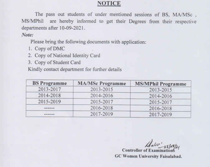 The Government College Women University Faisalabad (GCWUF) announced the degree collection date for various departments. Thus, the students of BS, MA/MSc, and MS/M.Phil can collect their degrees from the university after 10 September 2021. So, the students can get their degrees for the concerned Departments by submitting the required documents.