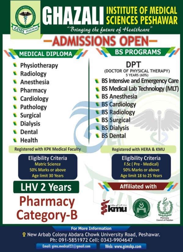 If you are a Matric or Intermediate degree holder & looking to pursue your BS degree or Medical diploma, this article is meant for you. Ghazali Institute of Medical Sciences Peshawar offers BS degrees & Medical diploma programs in various fields. Therefore, if you reside in Peshawar or any other city in Pakistan, you can apply for it.
