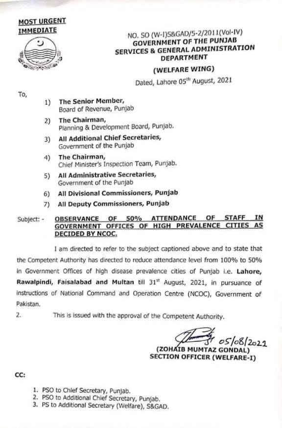 In the recent notification of Punjab government, Administration Department, the govt asked the 50% staff in offices. In the direction of the NCOC, the government ordered to reduce the staff from 100% to 50%. The government took this decision due to the high rate of COVID-19. However, the announced notification is for the cities in which the COVID positivity rate is high. Those cities are as follows.