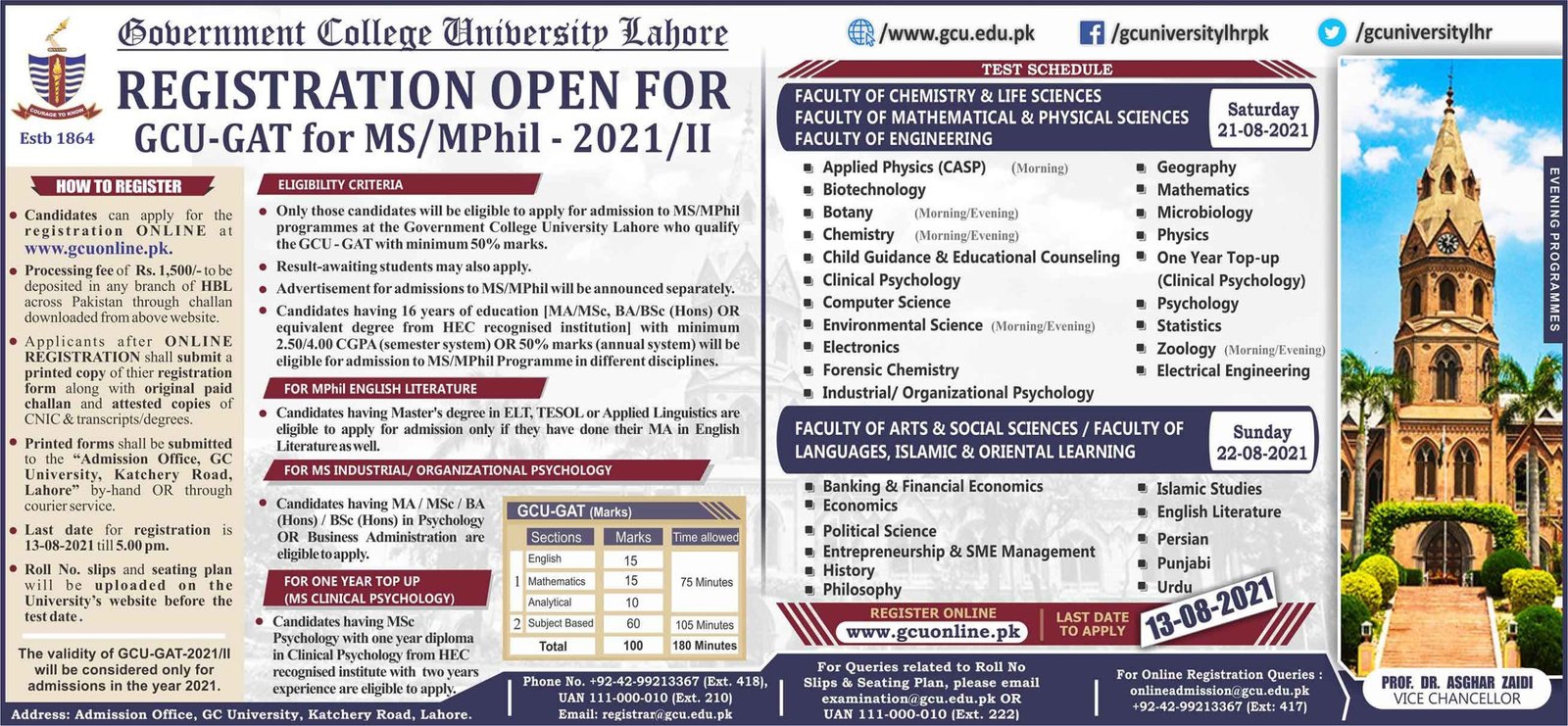 GCU Lahore Test Schedule 2021:
