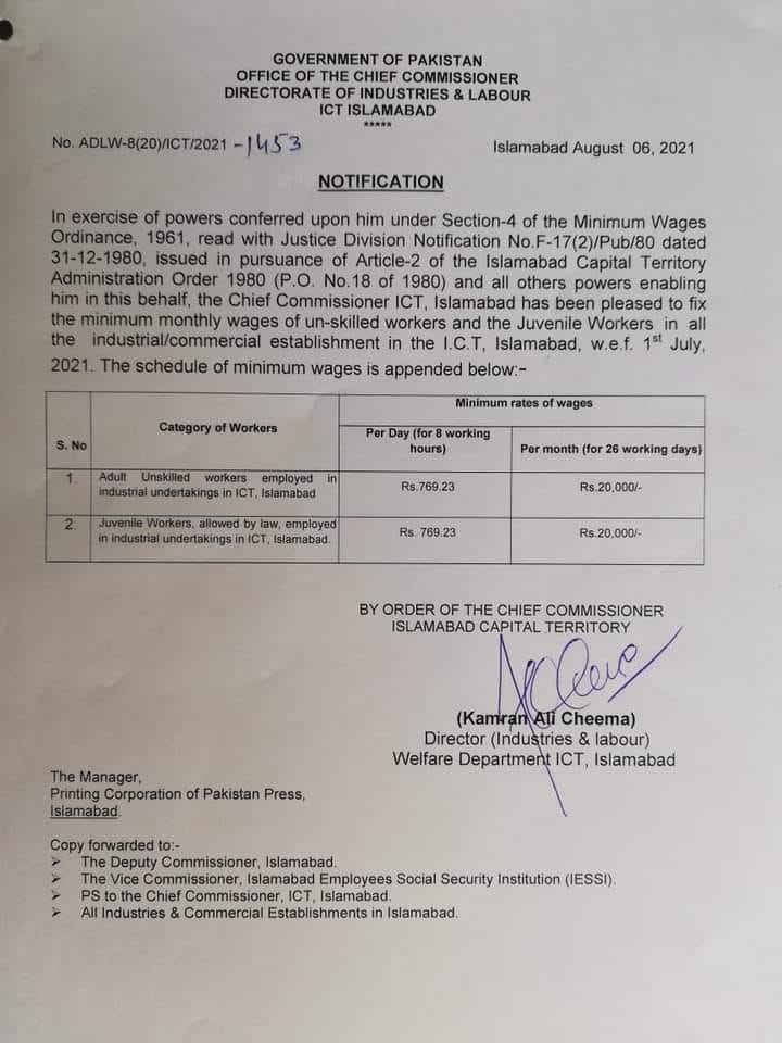 The Government of Pakistan issued a notification regarding the increment in monthly wages of the employees. The announced notice is for the unskilled workers and Juvenile workers. Thus, the given increment of workers in all the commercial/industrial establishments in the ICT Islamabad will implement wef of 01 July 2021. However, below are the details regarding the minimum monthly wages.