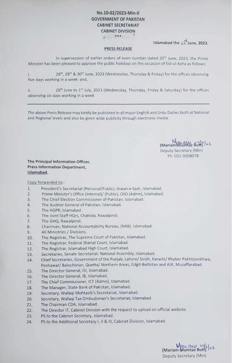 The Government of Pakistan issued a revised notification of Eid-ul-Azha. According to the details, the Eid-ul-Azha Holiday will now begin on 28th june 2023 till Sunday. Thus, the holidays observe from Wednesday to Sunday (28th June 2023 to 1st July 2023). The Prime Minister of Pakistan approved these Eid Holidays. Being an Islamic State, Eid-Ul-Azha is celebrated as a national festival in Pakistan. Each year, in connection with celebrations of the Eid-Ul-Azha, Government declares National holidays in Pakistan. The KPK government also announced four holidays of Eid. All government and private offices will follow this schedule.