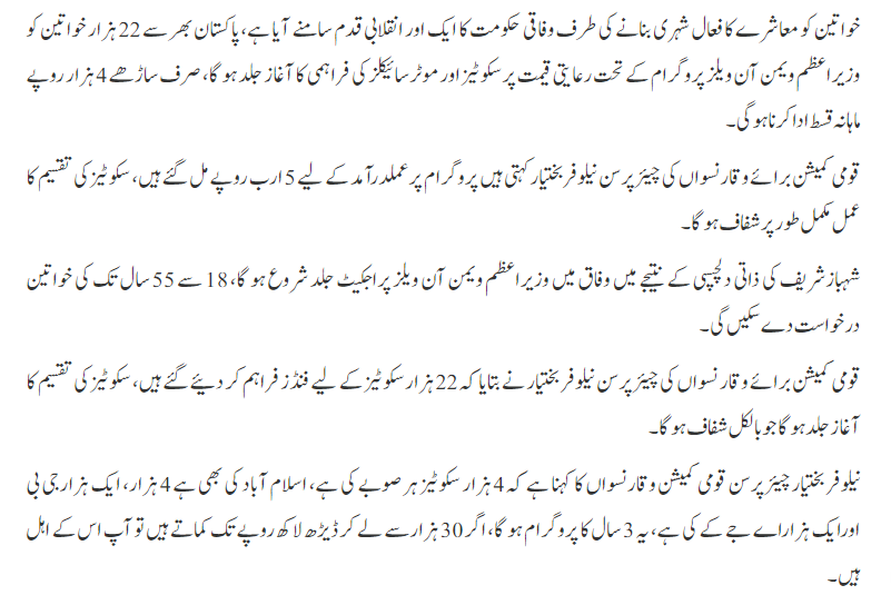 Under this program, around 22,000 women from Pakistan will be provided subsidised scooters and motorcycles. The monthly instalment is only 4,500 rupees. The government provided the funds for only 22000 scooters. Women between the ages of 18 and 55 can apply for the program.