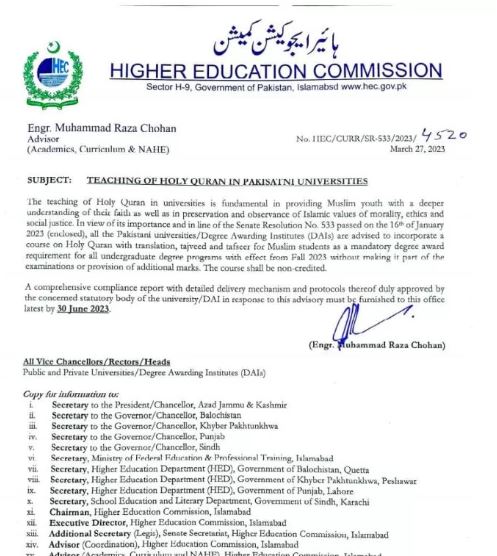 Have a look at the detailed notification of teaching Holy Quran in Universities issued by HEC