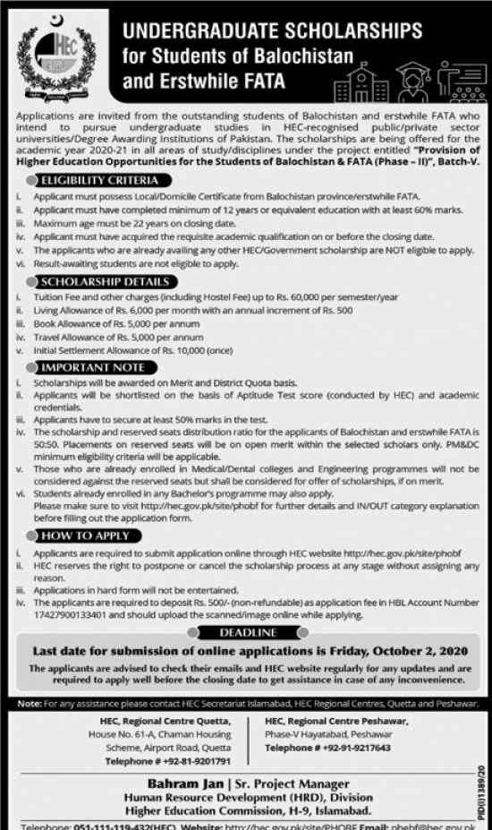 The Higher Education Department HEC has invited applications for the undergraduate scholarship program 2020. This scholarship is especially announced for the Balochistan and FATA students. Candidates having local Certificate/Domicile of Balochistan or erstwhile FATA for the award of Scholarships for Undergraduate Studies are eligible to apply. This undergraduate scholarship is being announced by the Provincial HEC. It is an excellent educational opportunity for the students of Balochistan to pursue their education.