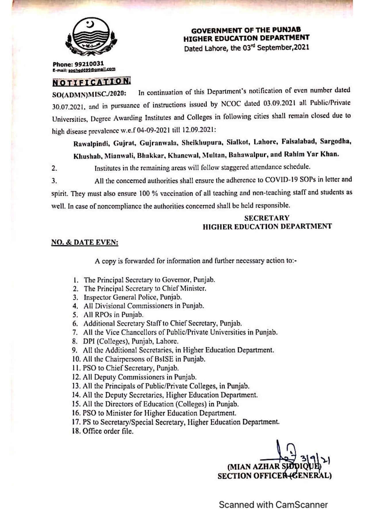 However, below is the notification of HED regarding the closure of universities in Punjab.