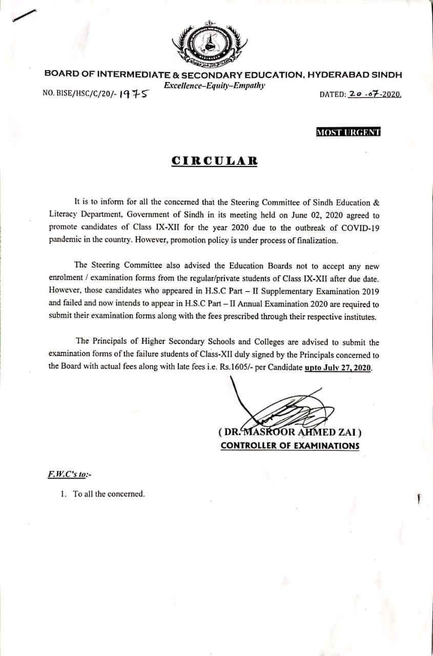 The Government of Sindh conducted a meeting on 2nd June 2020 under the steering Committee of the Sindh Education and Literacy Department. Due to the COVID-19 pandemic, they agreed to promote the students from class 9th and 12th. But the promotion policy is still stuck on the way. However, it is under the process of finalization. Addressing the meeting, the Steering Committee also ordered the education Board not to accept any new registration or enrollment form from the private and regular candidates. Added further, he said that those students who give Higher Secondary Certificate Part-II exams and now failed could also appear in Higher Secondary Certificate Annual Examination 2020. Such candidates are requested to submit their examination form along with the processing fee via their institute.