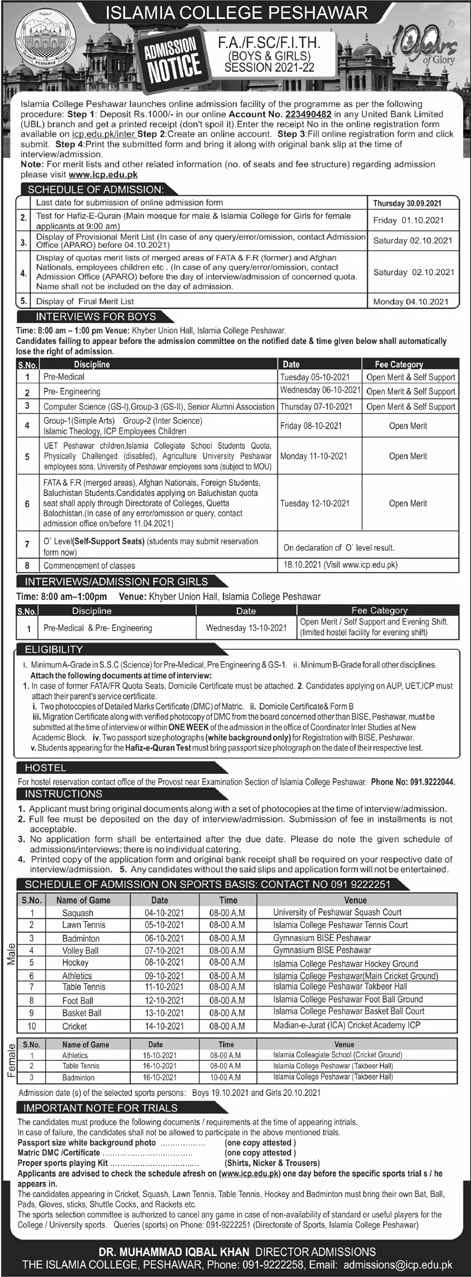 Details of Islamia College, Peshawar Admissions Fall 2021