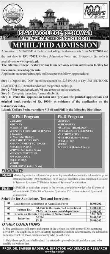 The Islamia College Peshawar has announced the M.Phil and PhD degree admissions for session 2020-21. The College offers different degree programs for postgraduate admissions. So, candidates having BS or M.Phil qualification can apply for the admissions. However, the admission form and prospectus are available on the college website. Thus, the last date to apply for postgraduate admissions is 15 January 2021.