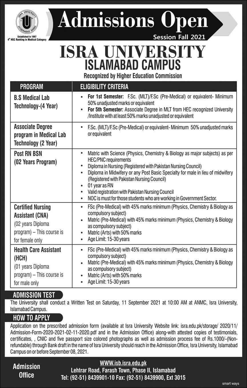 Admissions are open in one of the well-known universities named Isra University Islamabad. They offer admissions in BS Medical Lab Technology, Associate degree programs in Medical Lab, Post RN, BSN, Certified Nursing Assistant and Healthcare Assistant. Applicants who wish to get admission in the following degree program will apply now by following the general criteria. The qualification required for the following program is FSc or Matric. The university will issue the conduction of entrance test date.According to the schedule, the test will be conducted on 11 September 2021 at 10:00 AM at ANMC Isra University Islamabad Campus.