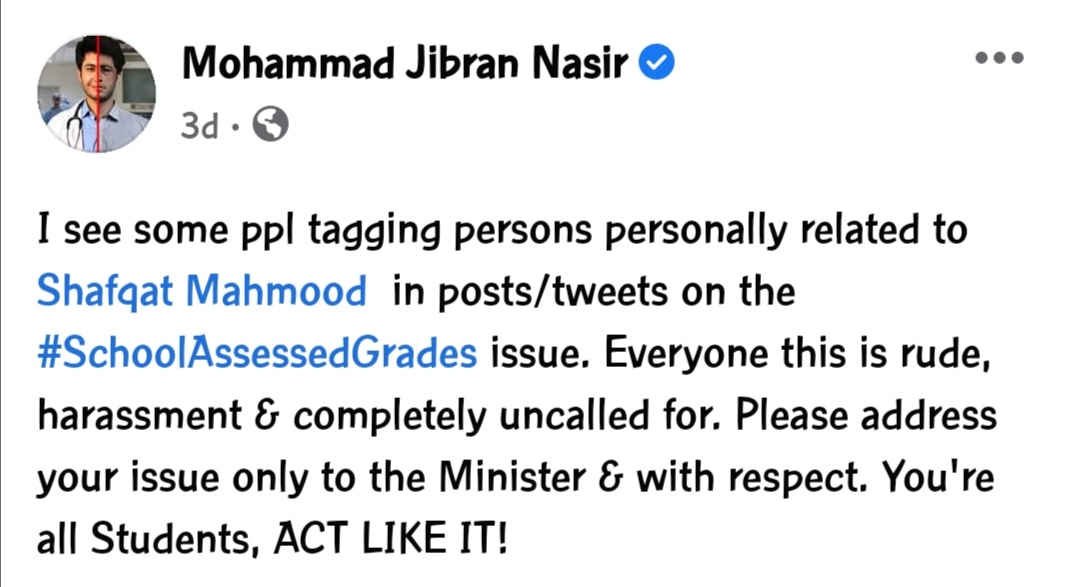 On this matter, Nasir Jibran who was also supporting students asked the students and people to be respectful. He stated that students have a right to raise their voices regarding the issues. But personal attacks, disrespectful words/comments are not   acceptable. He advised students to address their issues to the minister with respect.