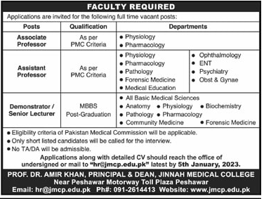 The last date for submission of Jinnah Medical College Peshawar Jobs application is 5th January 2023