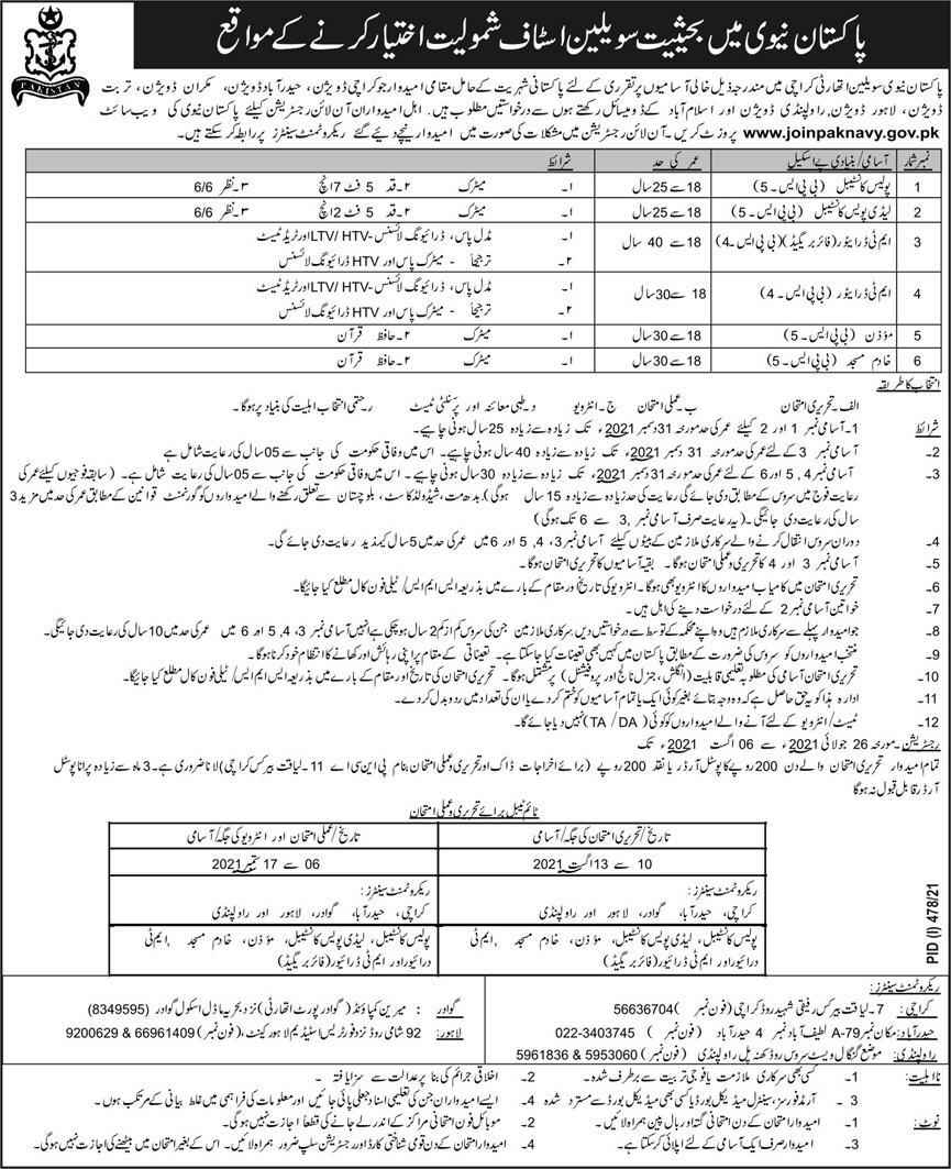 Pakistan Navy Civilian Authority Karachi announced the various job positions for the Pakistani citizens to join the Navy as civilian staff. The announced positions are for the Police Constables, MT Drivers, Mozan, and Khadim Masjid. Thus, candidates having matric and primary degrees are eligible to join Pak Navy as civilian staff. The registration for the civilian staff jobs has started from today, 26 July 2021. So, candidates who want to serve the country can apply for the announced Navy posts. For the post, candidates having Pakistani nationality and domicile of different districts can apply. The closing date of registration to join the Pak Navy as a civilian staff is 06 August 2021.