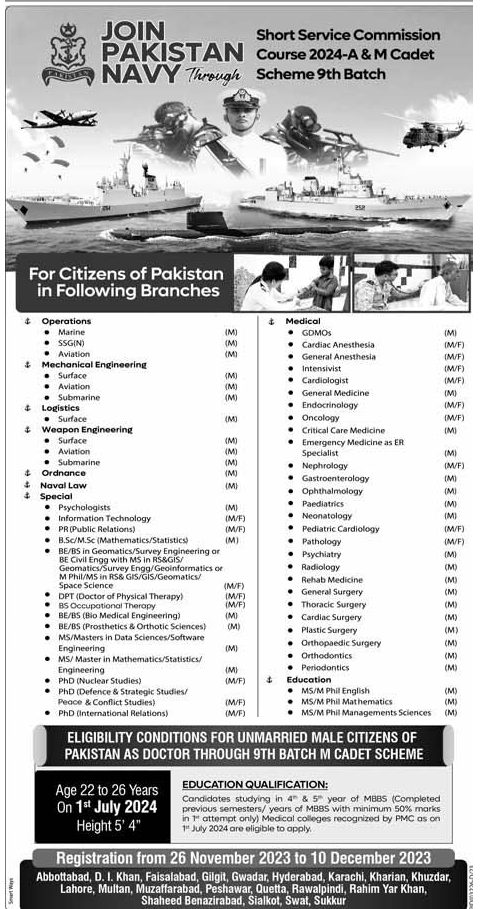Are you looking for Pak Navy jobs? If yes, then you visited the perfect place. Today, The Pakistan Navy officially announced the admission for session 2023-24. They offer admission in a short service commission of 2024- A&M cadet Scheme 9th batch. All male and female candidates who wish to join the very honourable department of Pakistan can apply by following the below instructions. The online registration has begun from 26th November 2023 and the last date for submission of application is 10th December 2023. So what are you waiting for? Go and Apply Now