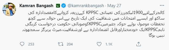 On 27 May 2021, the chief Minister of Special Assistant on Information talked about the recruitment of 1900 lecturers through KPPSC. In his tweet, he said that the purpose of recruiting lecturers through the KP Public Service Commission is to ensure transparency in the process. Furthermore, he said that KPPSC is a reliable organization. Thus, there will be no compromise on transparency and merit.