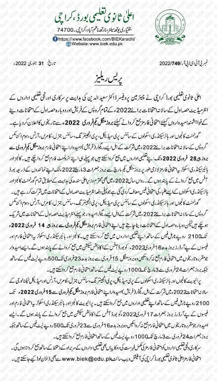 The latest BIEK notification is to notify you all that the Karachi board announced the annual exam form submission schedule of Intermediate for session 2022. The Karachi chairman, Prof. Dr. Saeed-ud-Din, ordered all public and private colleges to submit the examination forms for candidates appearing as Fresh Candidates or reappearing in first-year exams 2022. Students who failed in the previous inter exam will now have a chance to appear in exams in any group they can apply.