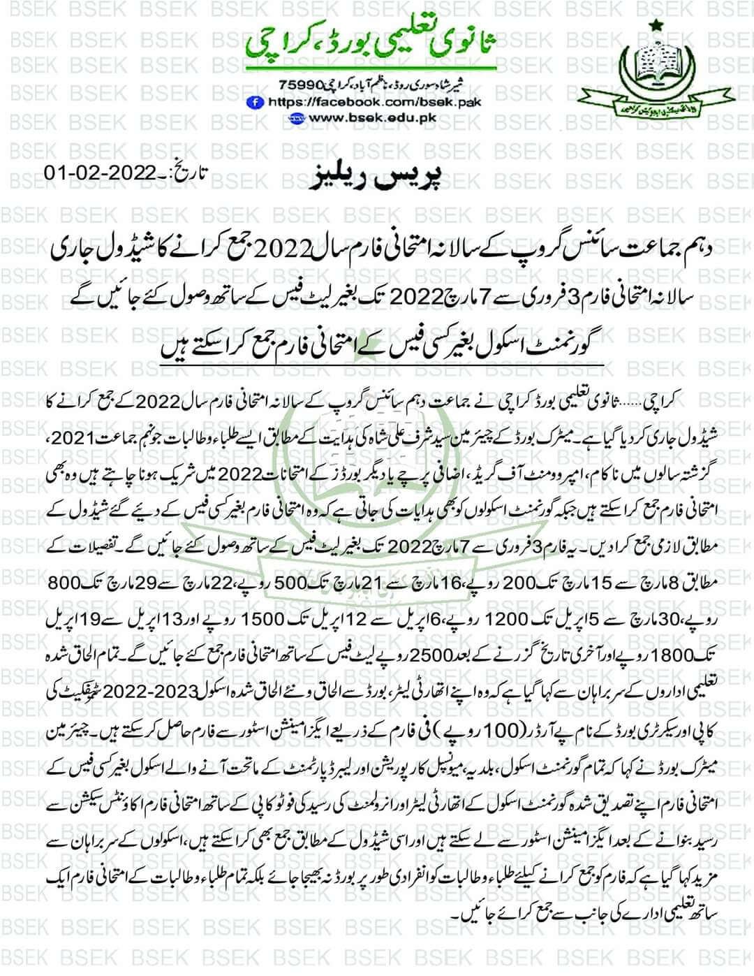 According to the latest notification, the Board of Intermediate Karachi announced the annual exam form schedule of matric (10th class) for session 2022. The Karachi board will accept the annual exam form of the science group from 3rd February 2022 to 7th March 2022 without a late fee. However, the government institution will submit an annual exam form free of cost. The students who got poor marks in the previous SSC examination and want to re-appear in the SSC exam will submit the annual exam form as well. According to the details, the Board of Intermediate Karachi issued a detailed schedule. Take a look