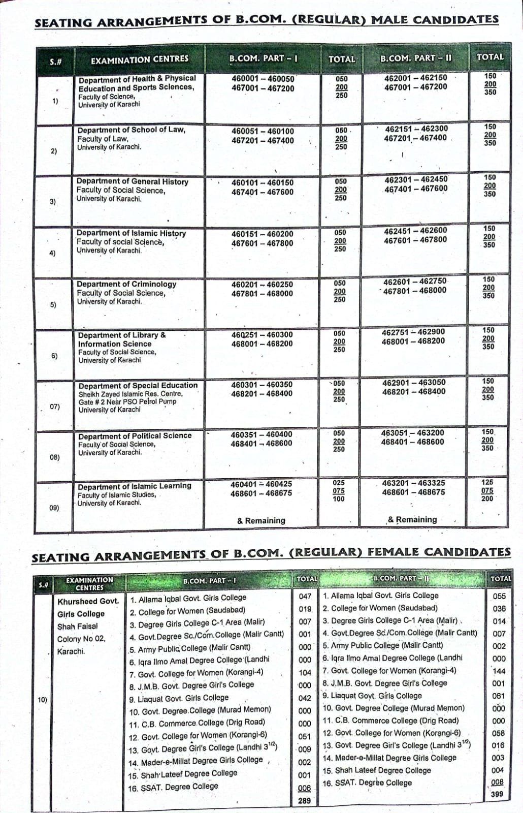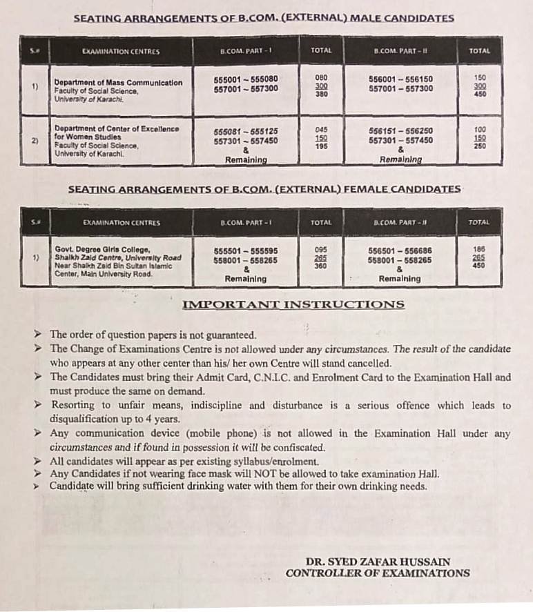 The university instructed the candidates enrolled in 2015 to appear in Urdu (Compulsory) papers strictly. However, all candidates must bring admit cards, CNIC, and enrollment cards to the examination centers. At the same time, the university also provided a seating arrangement for the B.Com Regular and external male and female candidates. You will get the complete detail below.