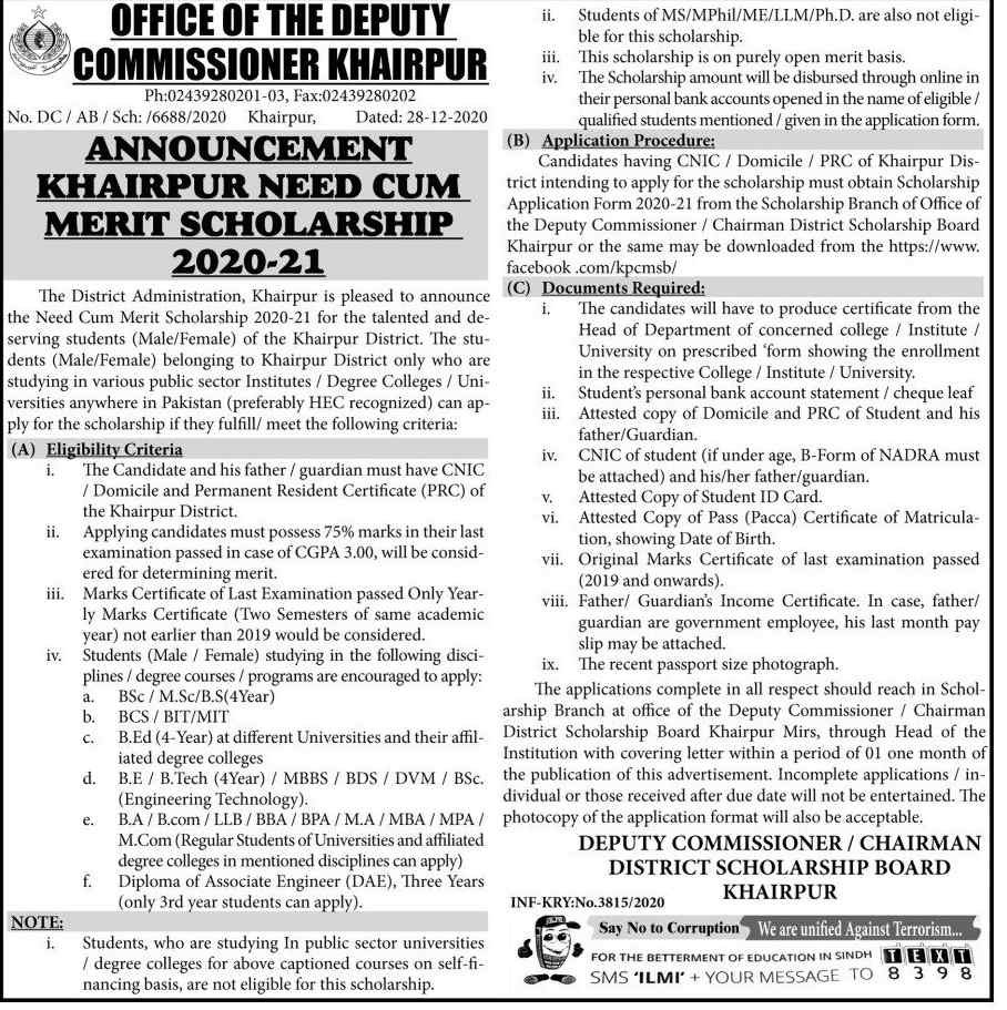 - Eligible and interested students can get the scholarship form from the Scholarship Branch of Office of Deputy Commissioner/Chairman District Scholarship Board Khairpur.