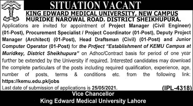 The King Edward Medical University New Campus Sheikhupura announced the latest jobs for different positions on an Adhoc/Contract basis. However, the university announced these positions for the Project “ Establishment of KEMU campus at Muridkey, District Sheikhupura.” Thus, interested candidates can apply for jobs through the KEMU website. However, for the KEMU jobs, the last date is 25 May 2021.