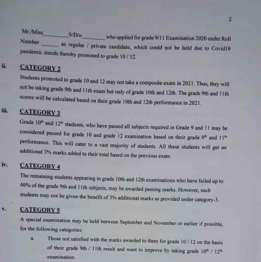 The 10th and 12th class students will receive the marks according to their 9th and 11th class performance. All students will also get 3% extra marks from the previous exams.
