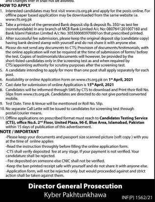 - For the KPK Prosecution Department jobs, candidates can apply through the Candidates Testing Service (CTS) website.