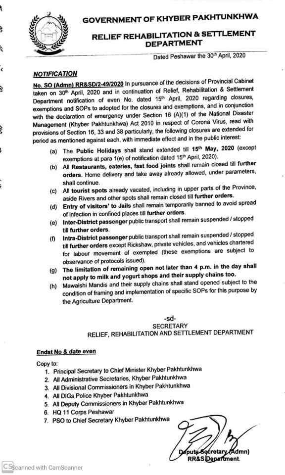 The Relief Rehabilitation and Settlement Department under the KPK government issued the latest notification about the extension of public holidays and other closures. The notification No. SO(Admn)RR&SD/2-49/2020 was published on 30 April 2020 by the KPK government.