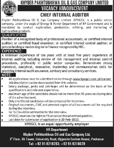 The wait is finally over. All candidates anxiously waiting for Khyber Pakhtukhwa OGDCL jobs will now get ready. The Khyber Pakhtukhwa Oil and Gas Development Company has invited applications for the latest career job opportunities for session 2023. They are looking for talented and well-qualified applicants for the position of Chief Internal Auditor. The job is permanent, and the job position is in Peshawar. Applicants who successfully completed their Master’s can apply for this position. The last date for submission of KP OGDCL jobs is 20th February 2023