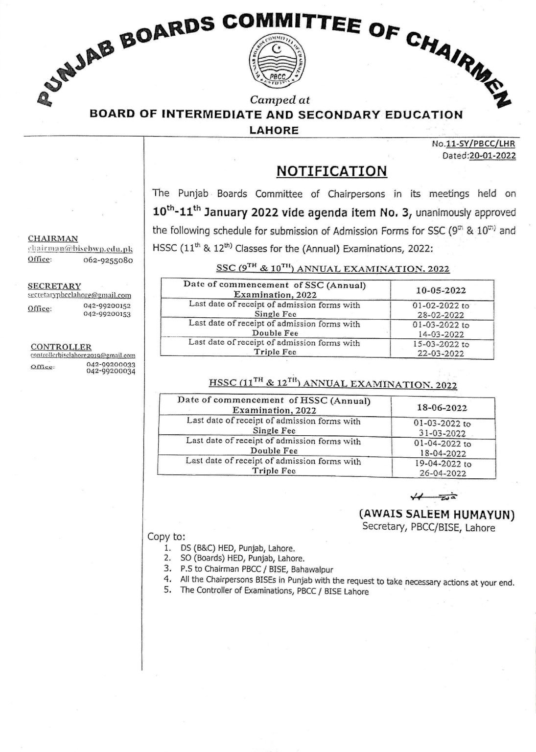 BISE Lahore HSSC Annual Examination Schedule 2022:-