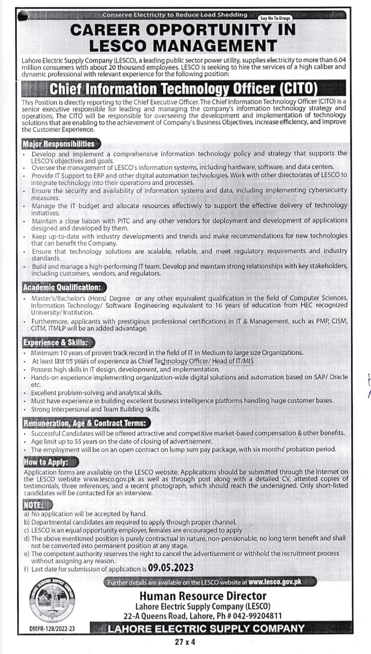 Lahore Electric Supply Company (LESCO) announced the latest job position for Pakistani Candidates. The advertised vacancy is for the Chief Information Technology Officer (CITO) post. So, candidates having a professional degree and meeting the required criteria can apply for the LESCO Latest Jobs 2023. The qualification needed for the LESCO Jobs is a 16-year degree with some experience in the relevant field. Interested candidates can visit the LESCO website to apply online or send the application with the required documents to the concerned office. However, the last date for the LESCO Jobs is 09 May 2023.